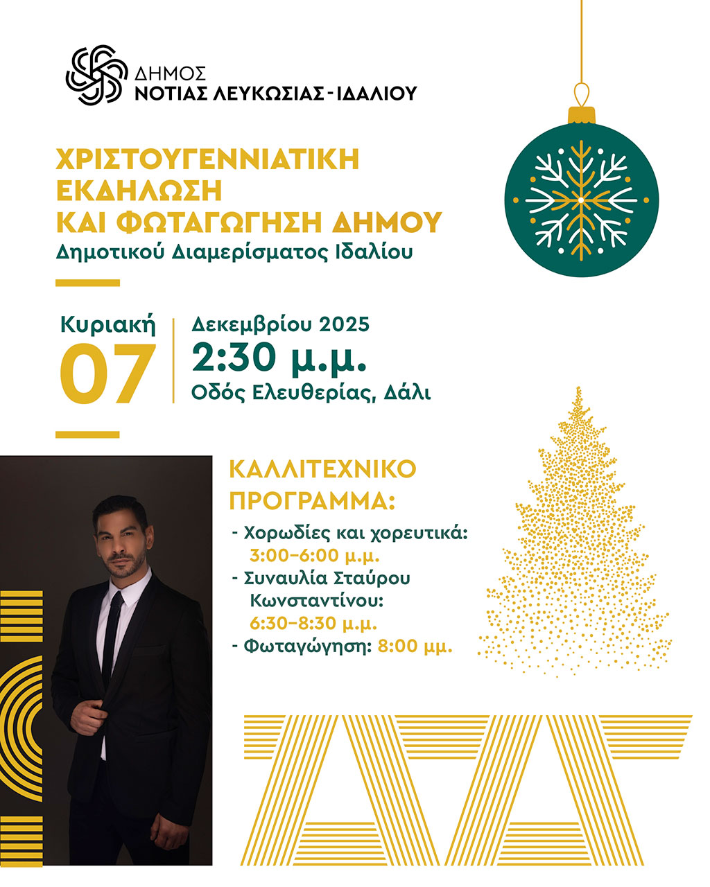 Το πλούσιο εορταστικό πρόγραμμα που έχει επιμεληθεί η Επιτροπή Πολιτισμού Δήμου Νότιας Λευκωσίας-Ιδαλίου, περιλαμβάνει -μεταξύ άλλων- χορωδίες και χορευτικά (3:15 μ.μ.-5:50 μ.μ.), συναυλία με τον Σταύρο Κωνσταντίνου (6:30 μ.μ.-7:50 μ.μ. και 8:05μ.μ.-8:30 μ.μ.) και φυσικά φωταγώγηση (8:00 μ.μ.).
